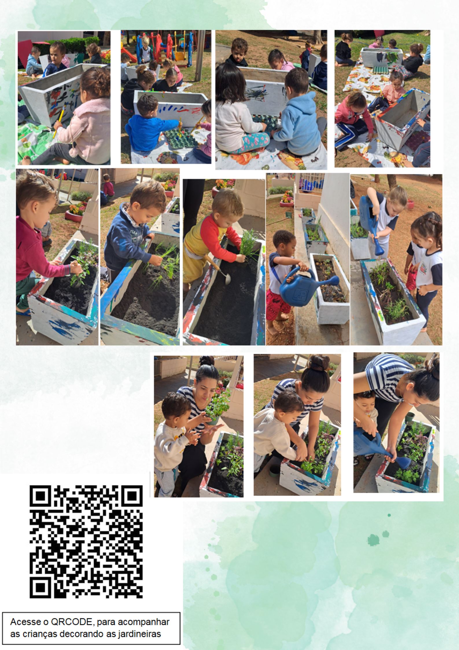 As crianças participaram de todo o processo, incluindo a decoração das jardineiras, onde utilizamos tinta guache, pincéis e muita criatividade.