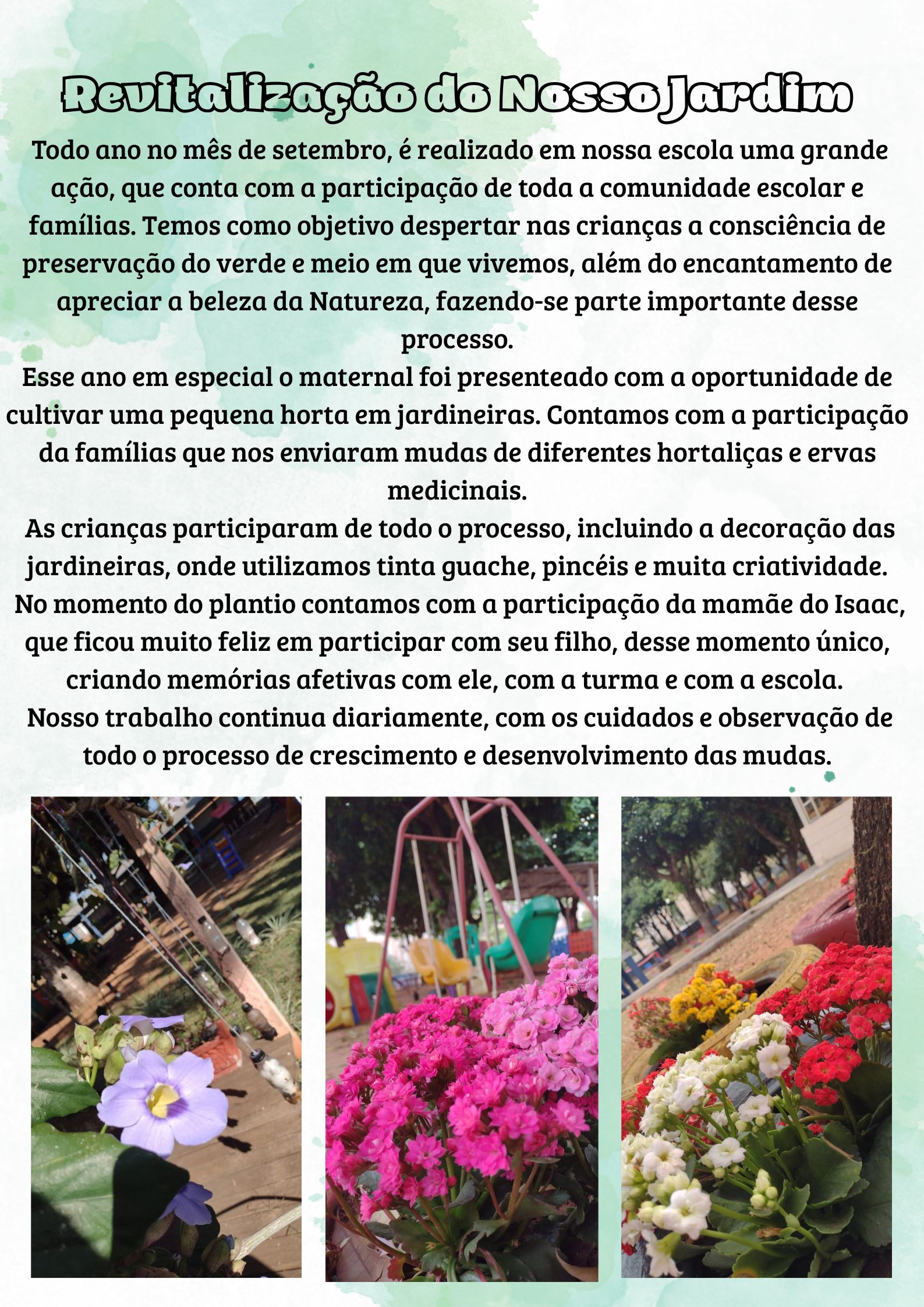 Todo ano no mês de setembro, é realizado em nossa escola uma grande ação, que conta com a participação de toda a comunidade escolar e famílias. Temos como objetivo despertar nas crianças a consciência de preservação do verde e meio em que vivemos, além do encantamento de apreciar a beleza da Natureza, fazendo-se parte importante desse processo.