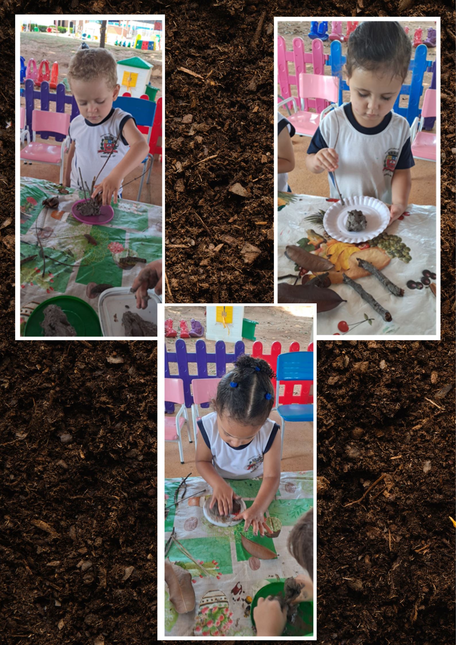 Oferecemos aos pequenos pedaços de argila com uma textura bem macia, juntamente com elementos da natureza que juntos recolhemos no jardim de nossa escola. Tivemos um momento de muitas experiências, descobertas e obras de arte surgiram.