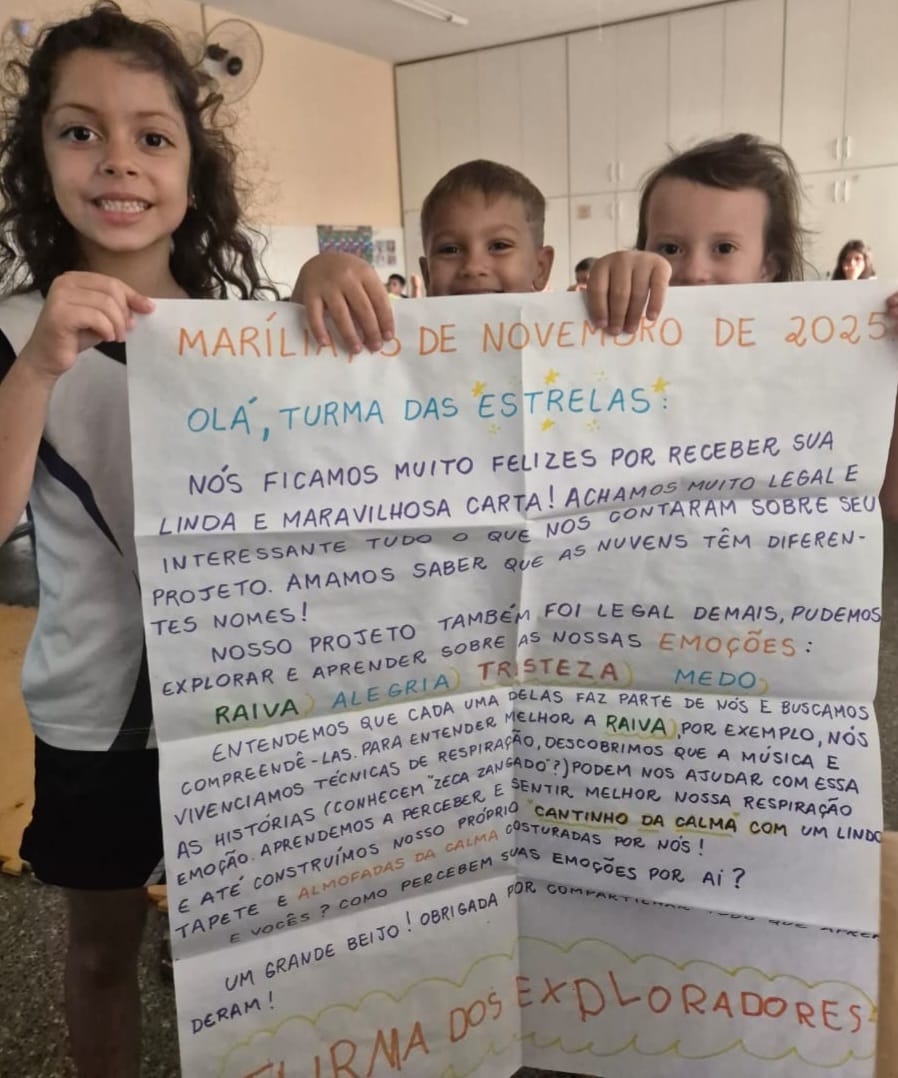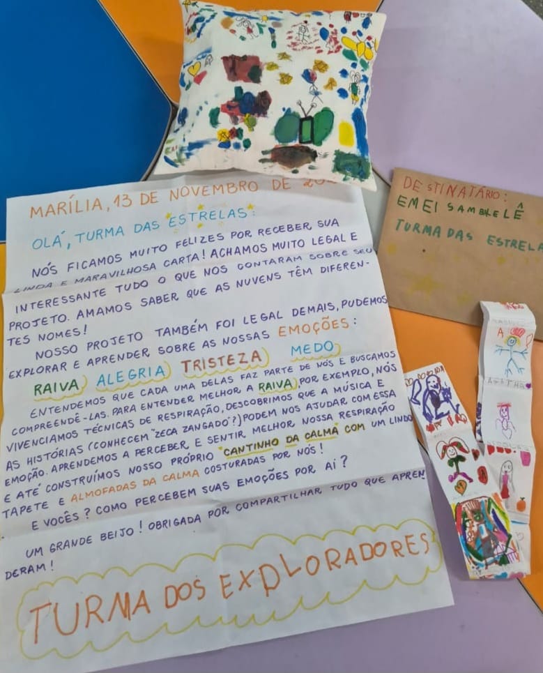 Após o preenchimento dos elementos formais do envelope, cada criança elaborou um autorretrato na mesa de luz como forma de apresentação pessoal. Na carta coletiva, o grupo compartilhou saberes sobre o Sistema Solar e fenômenos naturais, convidando a outra turma ao diálogo. O ciclo se completou com a chegada da resposta da Turma dos Exploradores; esse intercâmbio permitiu que as crianças notassem como diferentes grupos possuem interesses e formas distintas de investigar o mundo, valorizando a diversidade do aprendizado. A experiência integrou, na prática, noções de localização espacial, escrita para interlocutores reais, arte e a percepção de novas realidades escolares."